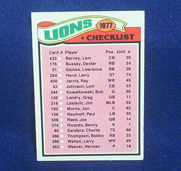 1977 DETROIT LIONS TOPPS PIŁKA NOŻNA LISTA KONTROLNA NIEOZNAKOWANA NIEKONTROLOWANA KARTA BARNEY HOF–