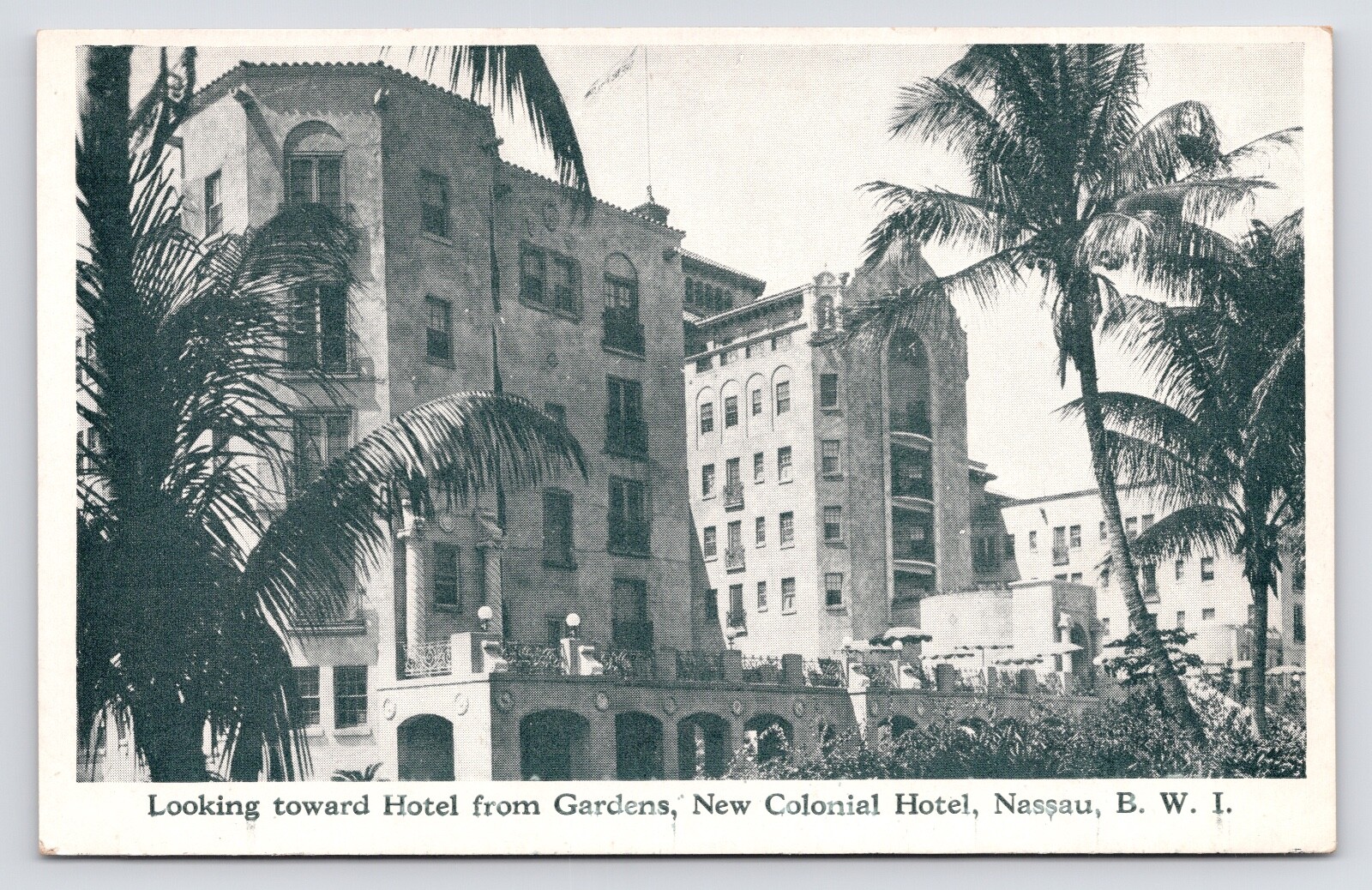 1920s Nowe kolonialne ogrody hotelowe i zewnętrzne Nassau Bahamy BWI Pocztówka–